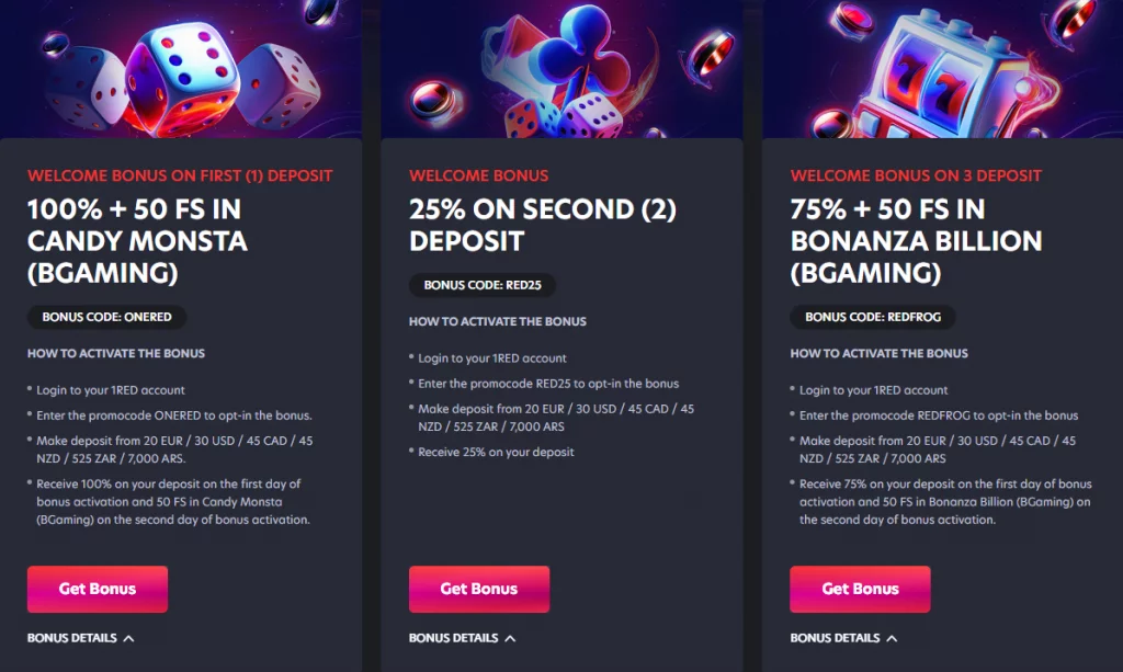 The casino welcome is designed to get you playing quickly without digging through small print. The first deposit step is a 100% match plus 50 Free Spins on a featured title, claimed with the ONERED OneRed promocode when the card shows it. The second step continues with a straightforward 25% match via RED25, and the third step lifts the value again with 75% plus 50 Free Spins using REDFROG. Free spins are deliberately issued on the following day to spread your sessions and make it easier to track wins and playthrough. Slots typically count 100% toward wagering, while table and live titles contribute less or can be excluded; if you want your progress bar to move at a steady pace, keep your play inside the eligible slot list until the requirement is complete.