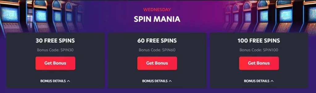 | Spin Mania (Wednesday) | 30 / 60 / 100 Free Spins (codes SPIN30 / SPIN60 / SPIN100) | Featured slots | Deposit thresholds and conversion rules printed beside the button. |